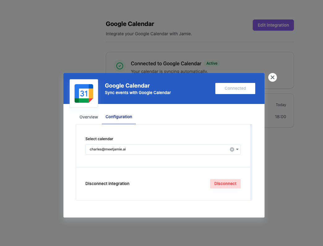 - If you would like to only sync events from one calendar associated with your connected account, you can clcik on Edit Integration (top right), open the configuration tab, and select the desired calendar from the dropdown.
